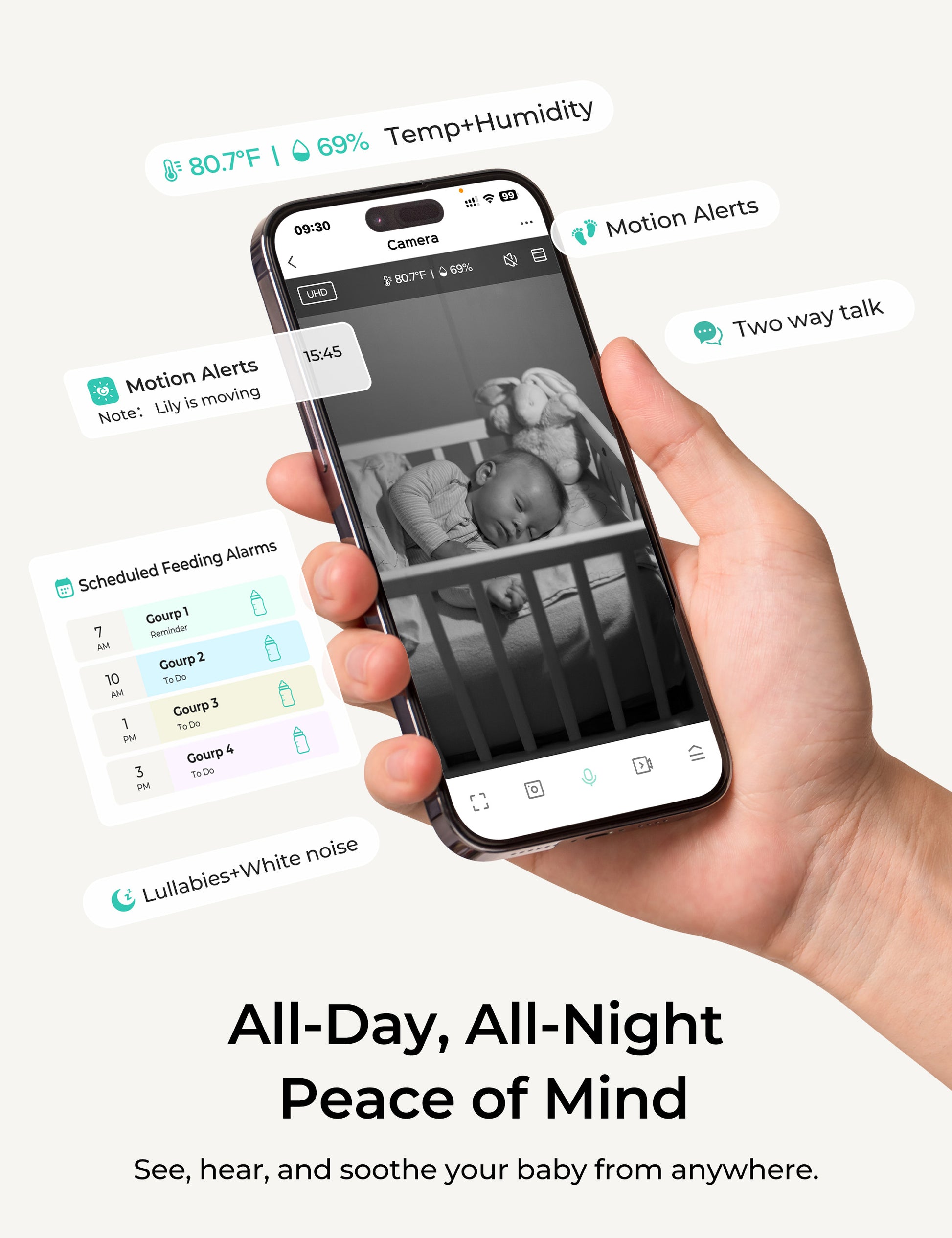 Create personalized safe zones in the app and receive real-time notifications if your baby wakes or moves beyond them. Protect your little one and enjoy uninterrupted peace of mind every moment.