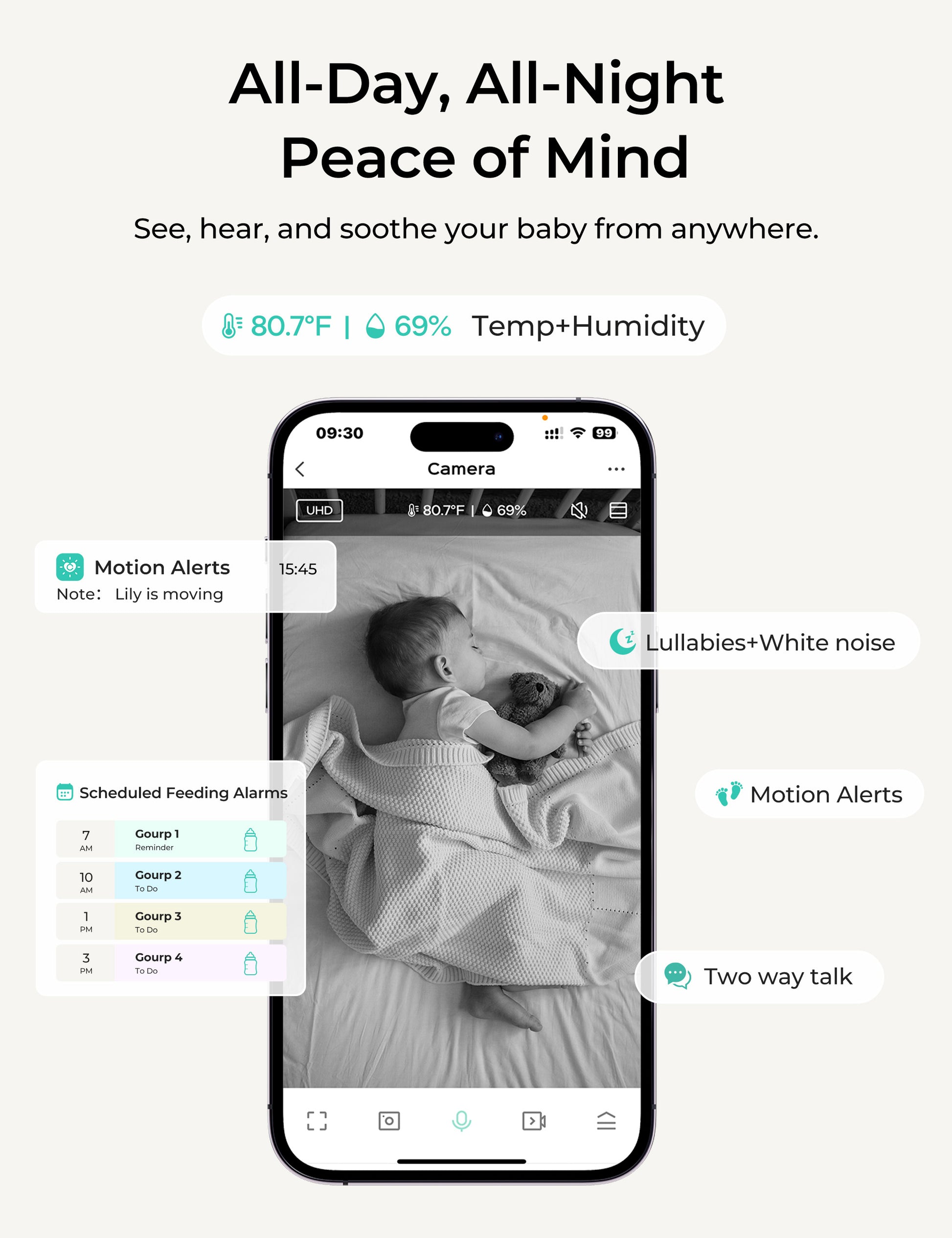Unübertroffene Akkulaufzeit : Mit bis zu 16 Stunden reinem Audio und 12 Stunden Video-Streaming können Sie Ihr Baby den ganzen Tag überwachen.