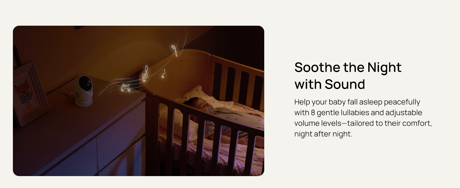 Stay closely connected to your little one with real-time sound alerts and advanced crying detection. Receive instant notifications the moment your baby needs you, so you can respond right away. Comfort them with gentle lullabies, soothing white noise, or the warmth of your own voice through two-way talk, creating a calming presence no matter where you are.