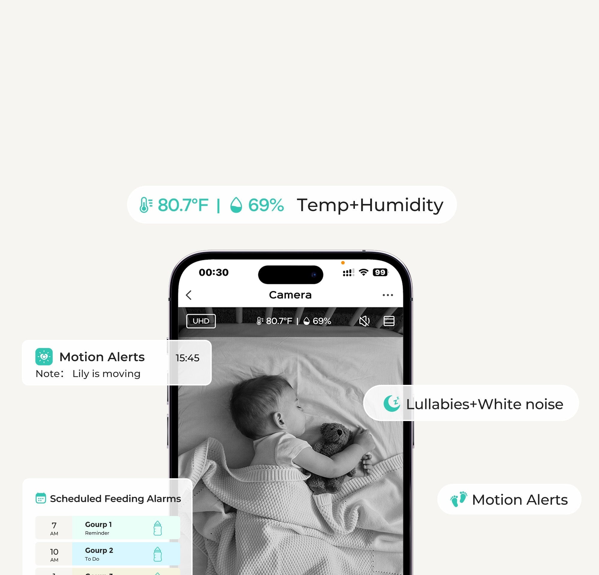 Create personalized safe zones in the app and receive real-time notifications if your baby wakes or moves beyond them. Protect your little one and enjoy uninterrupted peace of mind every moment.