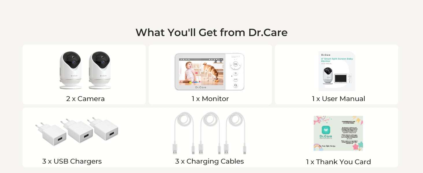 What You Get: At Dr.Care, we help every parent embrace the joy of parenthood without sacrificing personal time. The package includes 1 Dr.Care VistaView Lite RB baby monitor parent unit, 2 baby units, 3 USB-C charging cables, 3 power adapters, and 1 user manual. Enjoy a 1-year quality warranty with an additional 6-month warranty upon registration, plus 24/7 customer support.