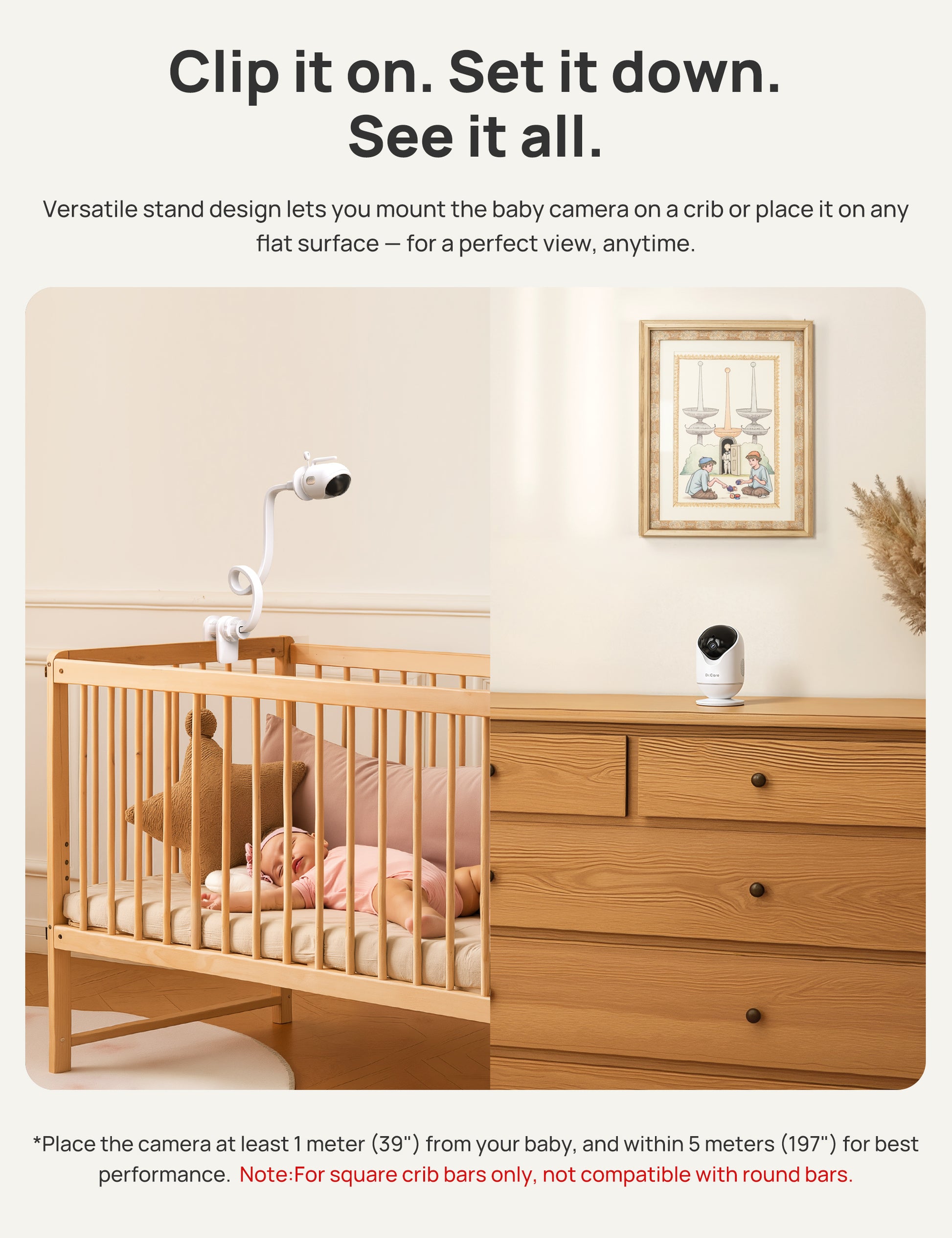 Always Keep Your Baby in Sight with Smart Tracking: With intelligent tracking and customizable alert zones, you can relax while your baby plays. The clip mount combines with the camera’s 300° rotation, 65° tilt, and 2X/4X zoom, keeping your baby in view. You’ll receive real-time alerts for sound and movement, so you can monitor them anytime, anywhere, ensuring peace of mind and constant visibility.
