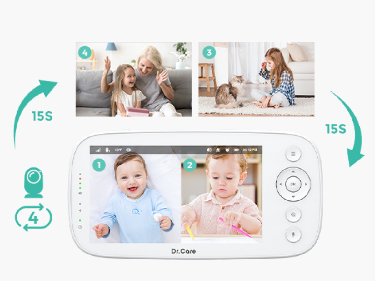 Enjoy the convenience of our Split Screen feature, letting you see two babies side by side on the screen simultaneously. Connect up to 4 cameras (sold separately) to keep an eye on your kids, pets, and elderly family members. With our best-in-class 5000mAh rechargeable battery, you can have peace of mind all day and night, offering up to 18 hours of video streaming and 30 hours in Voice Activated Alert (VOX) mode.